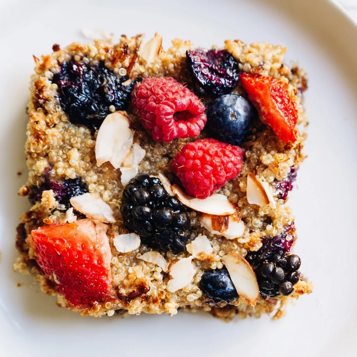 Topping with chopped nuts and shredded coconut before baking adds crunch and subtle flavor contrasts to the soft quinoa and berries.