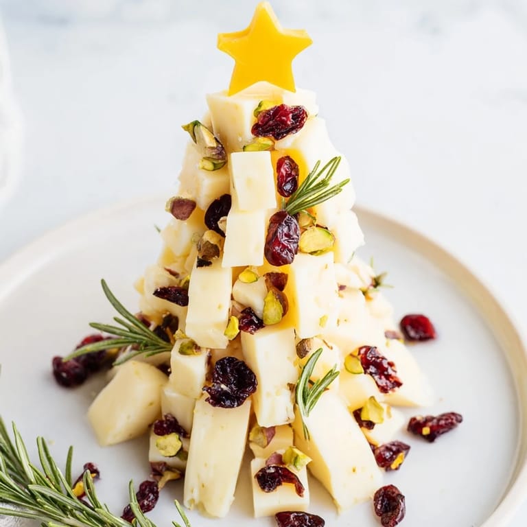 Save A festive and visually stunning cheese and fruit appetizer shaped like a holiday tree, made with creamy white cheddar, tangy dried cranberries, and fresh herbs.