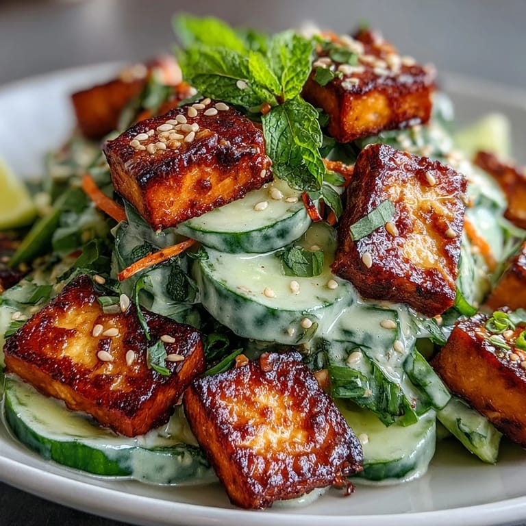Save The sound of cucumbers hitting the colander is what I remember mostβthat hollow, satisfying clatter. I was experimenting with ways to use up a block of tofu that had been sitting in my fridge for days, and I wanted something that felt fresh but still filling. My kitchen smelled like ginger and sesame oil, and I kept tasting the dressing straight from the bowl, adjusting the sriracha until my lips tingled. When I finally tossed everything together and took that first bite, the contrast between cool, crisp cucumbers and hot, crunchy tofu made me actually laugh out loud.