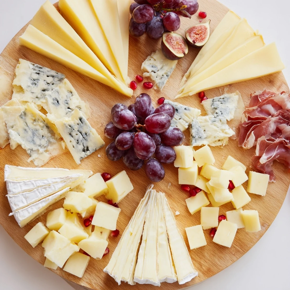 - Arrange the cheeses at the center of a large wooden board in the shape of a star alternating types for color and texture contrast.
