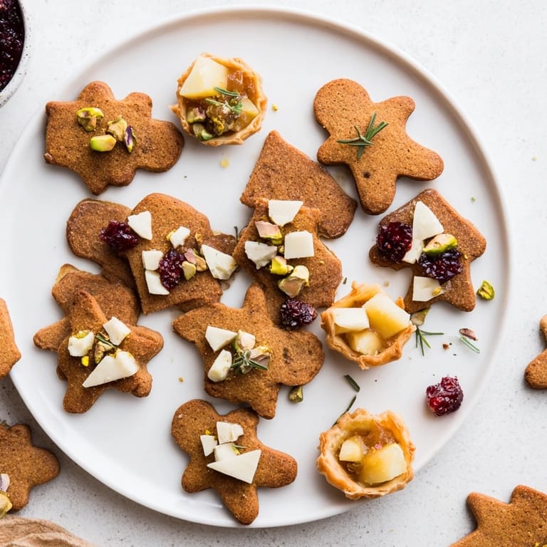 Use a light dusting of flour when rolling out the gingerbread dough to prevent sticking but avoid over-flouring to maintain soft cookies. When melting white chocolate, be careful not to overheat to avoid seizing. For even baking of the tartlets, ensure the puff pastry rims are pressed well into the muffin tin to support the filling.