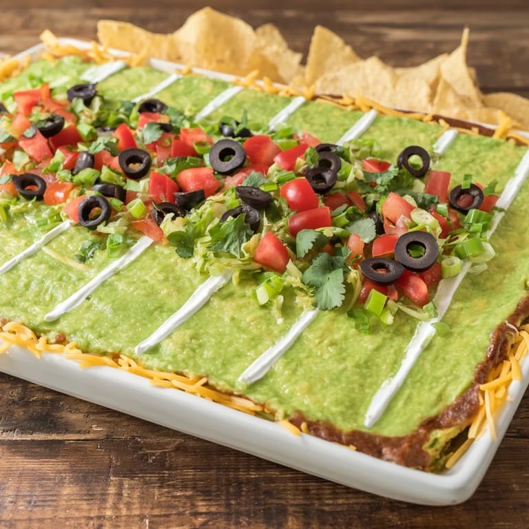 Save A festive and crowd-pleasing layered dip arranged to resemble a football field, perfect for game day gatherings.