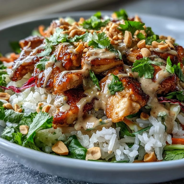 For a vegetarian version of this bowl, simply substitute the chicken with firm tofu or tempeh. You can also increase the vegetable content by adding sliced cucumber, edamame, or thinly sliced bell peppers for extra crunch and color. If you prefer more heat, don't hold back on the chili flakes in the peanut sauce.