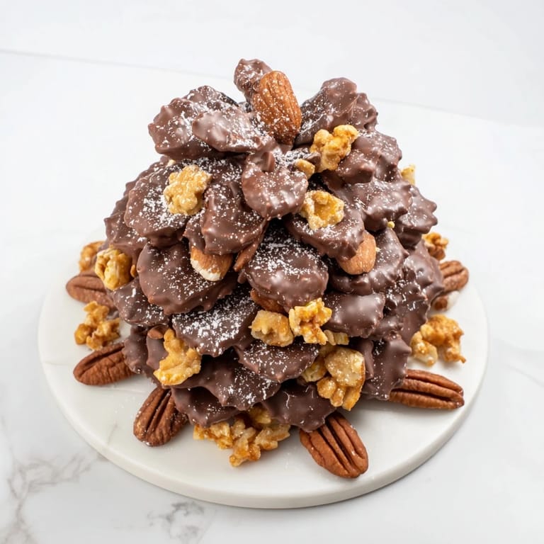 Save A whimsical, crunchy dessert featuring chocolate-coated nut clusters shaped like pinecones, perfect for holiday gatherings or as an elegant woodland treat.
