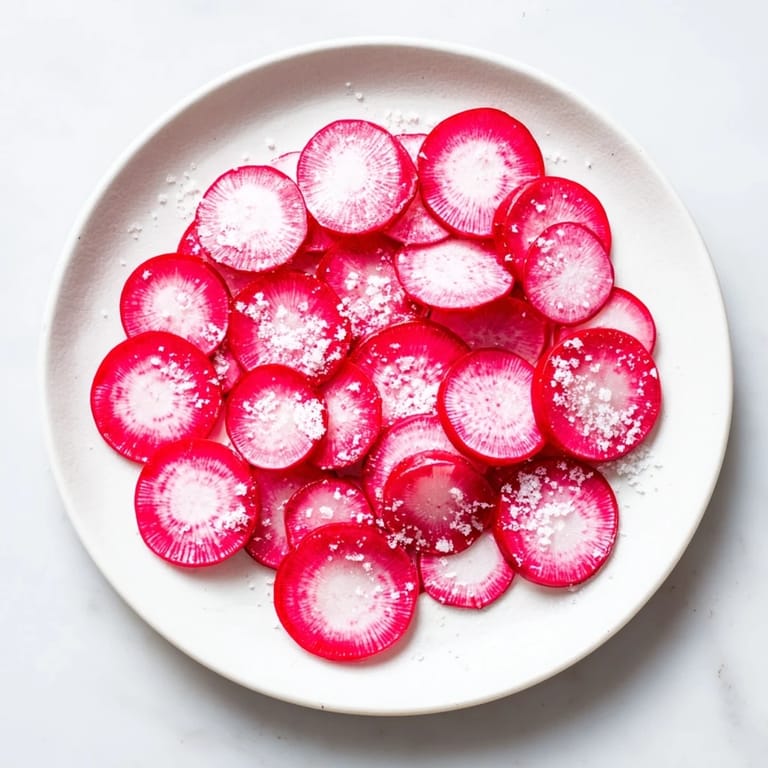 - Sprinkle the flaky sea salt evenly over the radish slices.